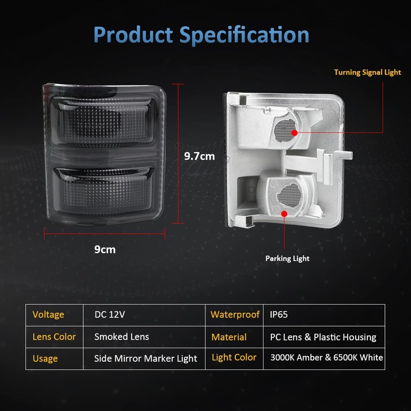 • 【Super Bright】Turning signal mirror light is with 6500K white color canbus bulbs for side marker running/parking light, 3000K amber color canbus bulbs for turn signal light.