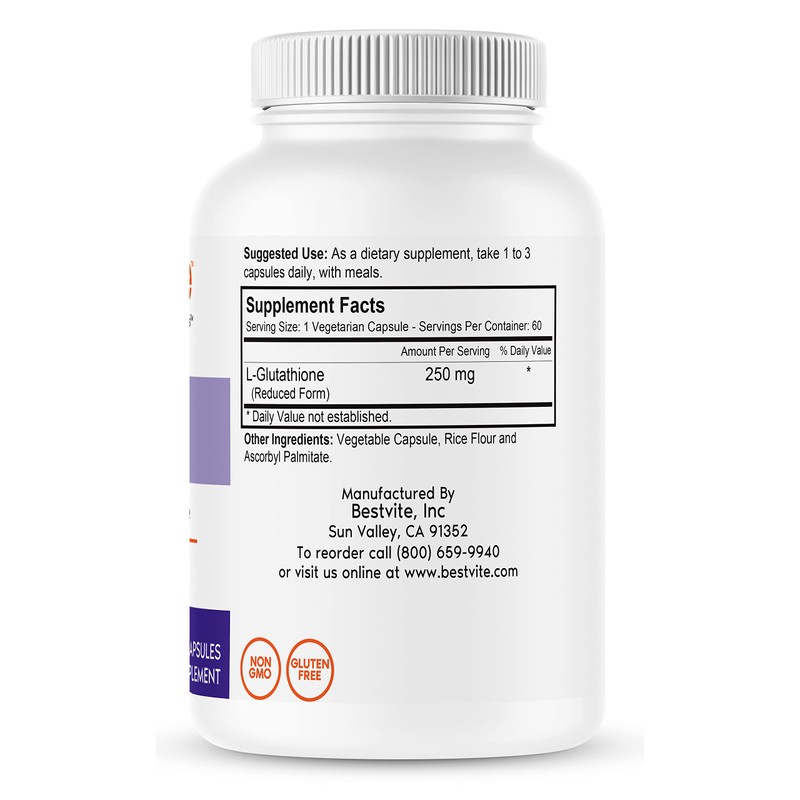 BESTVITE L-Glutathione 250mg (60 Vegetarian Capsules) - No Stearates - Vegan - Non GMO - Gluten Free