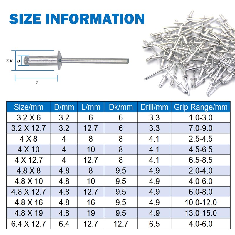 - RIVET SIZE - 3.2mmx6mm(1/8"x1/4"). Diameter is 3.2mm, grip length is 6mm