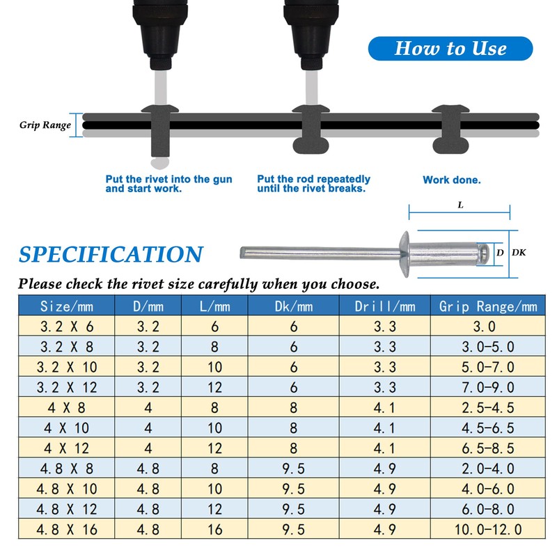 - RIVET SIZE - 4.8mmx12mm(3/16"x1/2"). Diameter is 4.8mm, grip length is 12mm