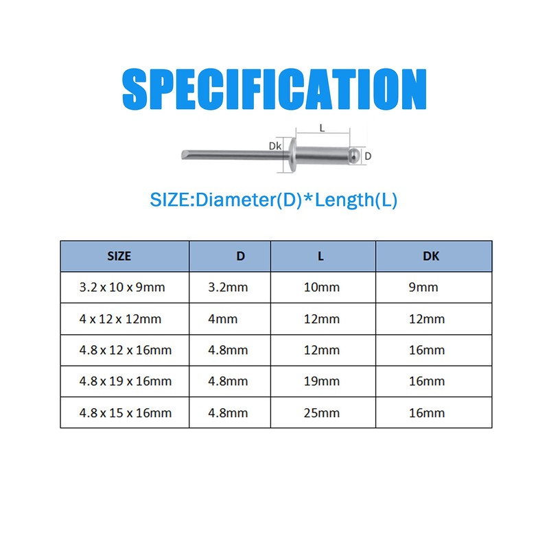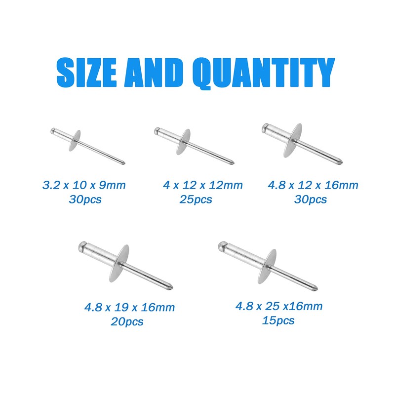 • 【ASSORTED SIZES】120pcs Aluminum Rivets Assortment Kit Include: 3.2 x 8 x 9mm (30pcs), 4 x 12 x 12mm (25pcs), 4.8 x 12 x 16mm (30pcs), 4.8 x 19 x 16mm (20pcs), 4.8 x 25 x 16mm (15pcs). Organized in a divided case so you can quickly and easily find the size you need, provides more convenience for your work.