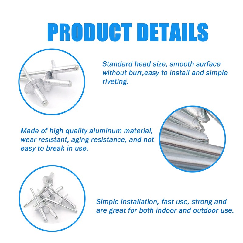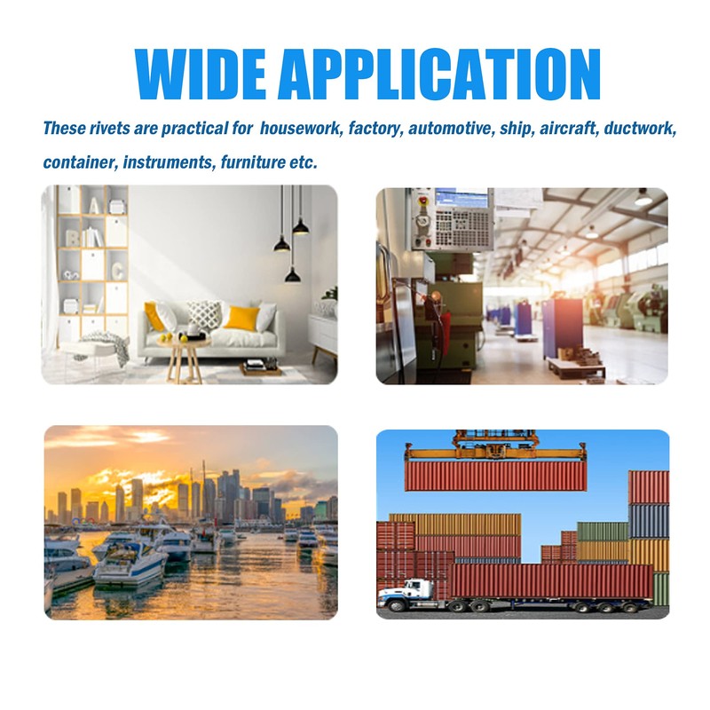 • 【WIDE APPLICATION】These rivets are perfect to apply in automotive, ship, aircraft, ductwork, elevator, instruments, furniture etc, ideal for joining materials such as sheet metal, plastics, rubbers and laminates. They are very strong and are great for both indoor and outdoor use.