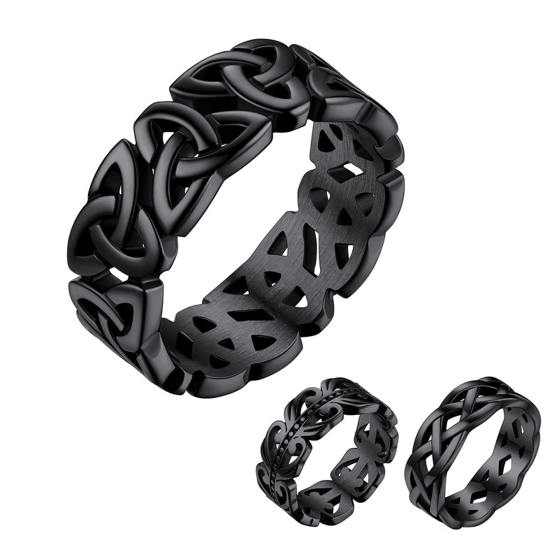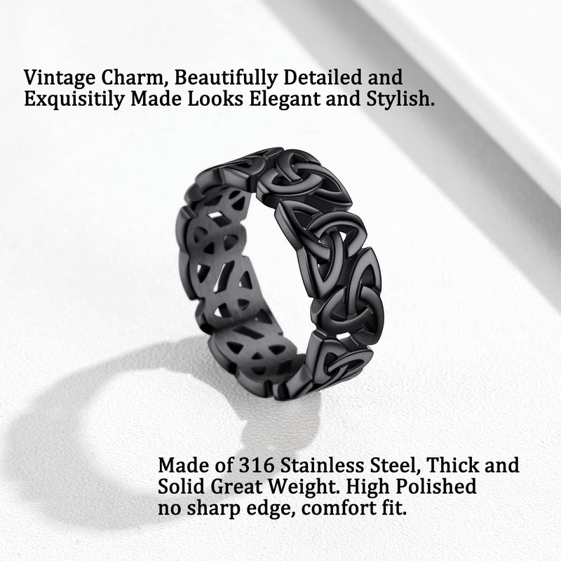 Bestyle Black 7.5mm Wide Celtic Trinity Knot Eternity Wedding Engagement Band Ring, Solid Thick Irish Celtic Trinity Flower Finger Ring Stackable, Size 7