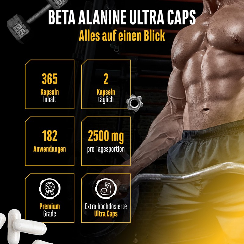 - Maximum dosage: with 1,250 mg beta-alanine per capsule, our Ultra Caps deliver a highly concentrated formula for ambitious athletes who want to redefine their performance limits. The practical XXL tin with 365 capsules provides a long-term and reliable supply, ideal for consistent training phases.