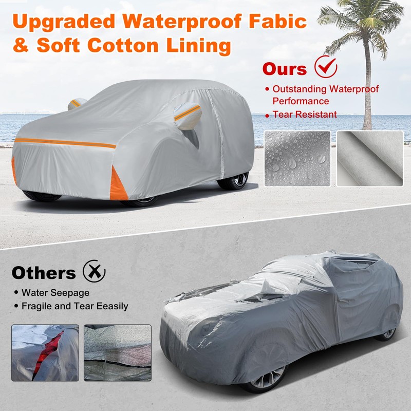 - All-Weather ProtectionMade of high quality PE&PEVA, the rav4 car cover has excellent performance such as waterproof, heat-resistant and quick-drying. The outer layer is coated with a water-resistant coating to ensure that the cover can withstand strong water pressure, making it ideal for use in rainy and snowy days. Highly reflective anti-UV coating can keep the car cool even on sunny days. The thicker cotton in the lining will protect the car paint better.