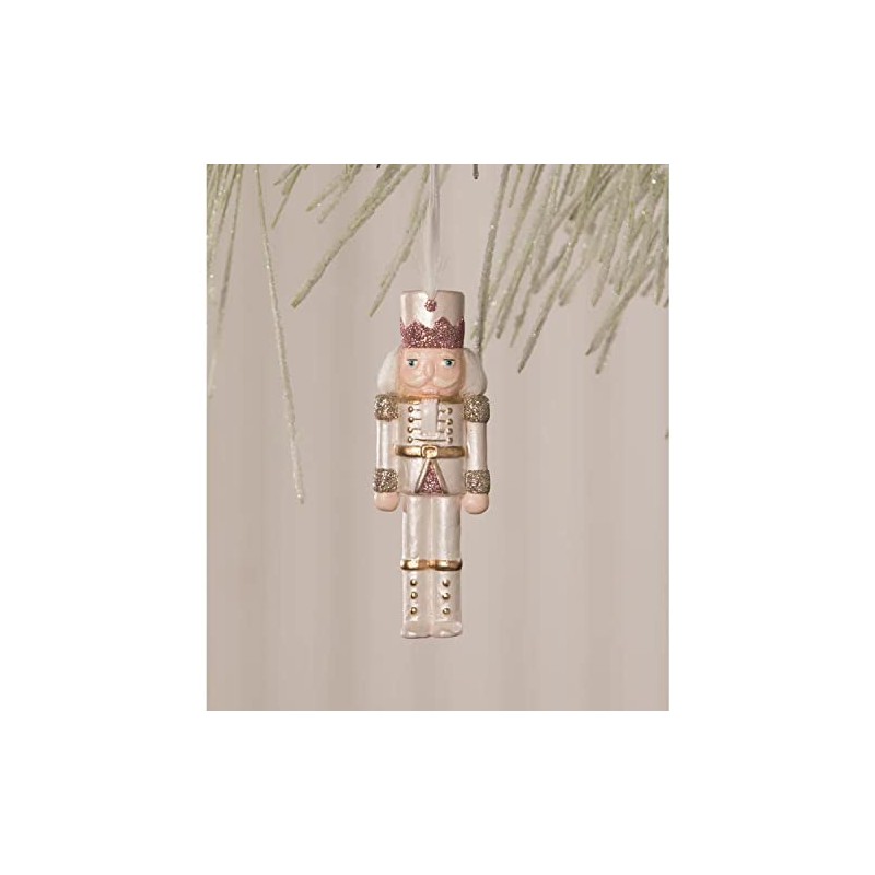 - A stylish nutcracker outfitted in pearl, metallic gold, and soft pink.