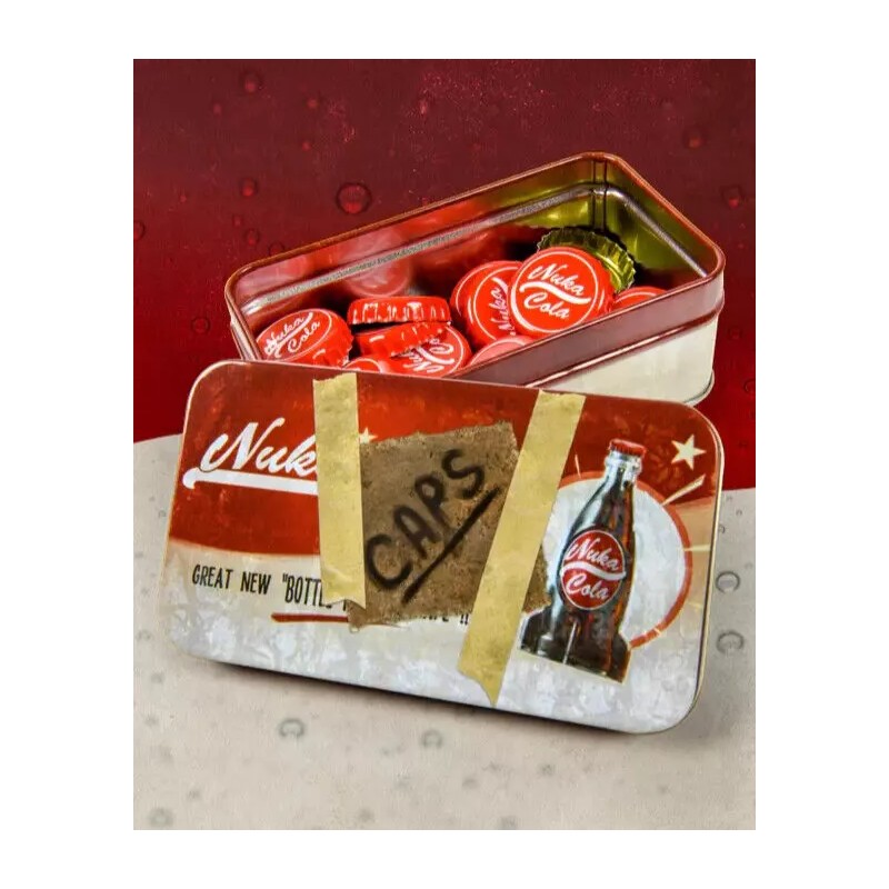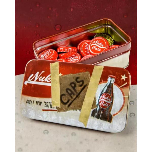 The Fallout Bottle Cap Series: Nuka-Cola with Collectible Tin includes a pocketable tin box that features Nuka-Cola artwork, helpfully labeled with the word, CAPS on the lid.