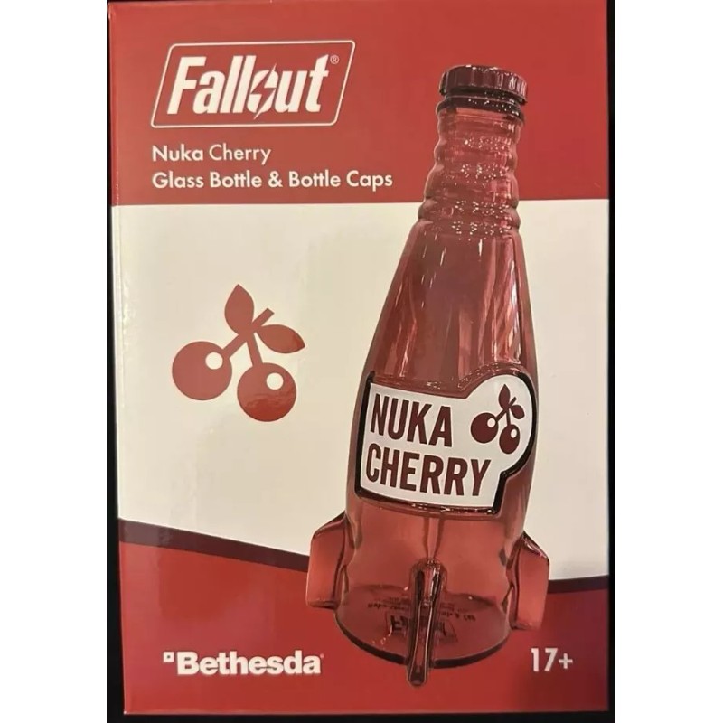 Bethesda Fallout Nuka Cola Cherry Glass Bottle + 10 Bottle Caps Rocket Replica Figure