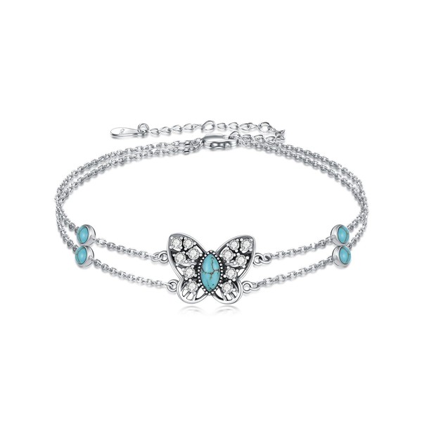 BETHZA Natural Turquoise Butterfly Bracelet 925 Sterling Silver Butterfly Adjustable Layered Foot Anklet Bracelet for Women Beach Summer Jewelry Gifts for Birthday