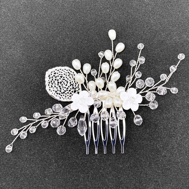 - Material: Alloy wire & comb & leaf, clear crystal beads, soft clay flower