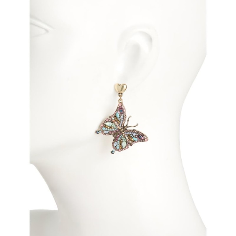 - DESIGN: Stunning butterfly drop earrings featuring intricate crystal embellishments in pastel turquoise, pink, and blue tones with antique gold-tone finish