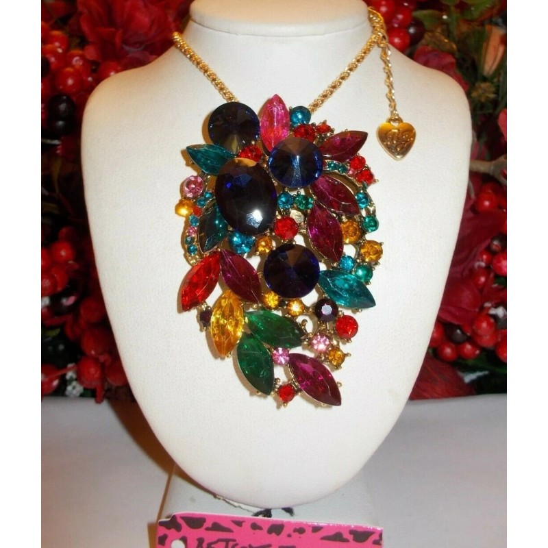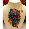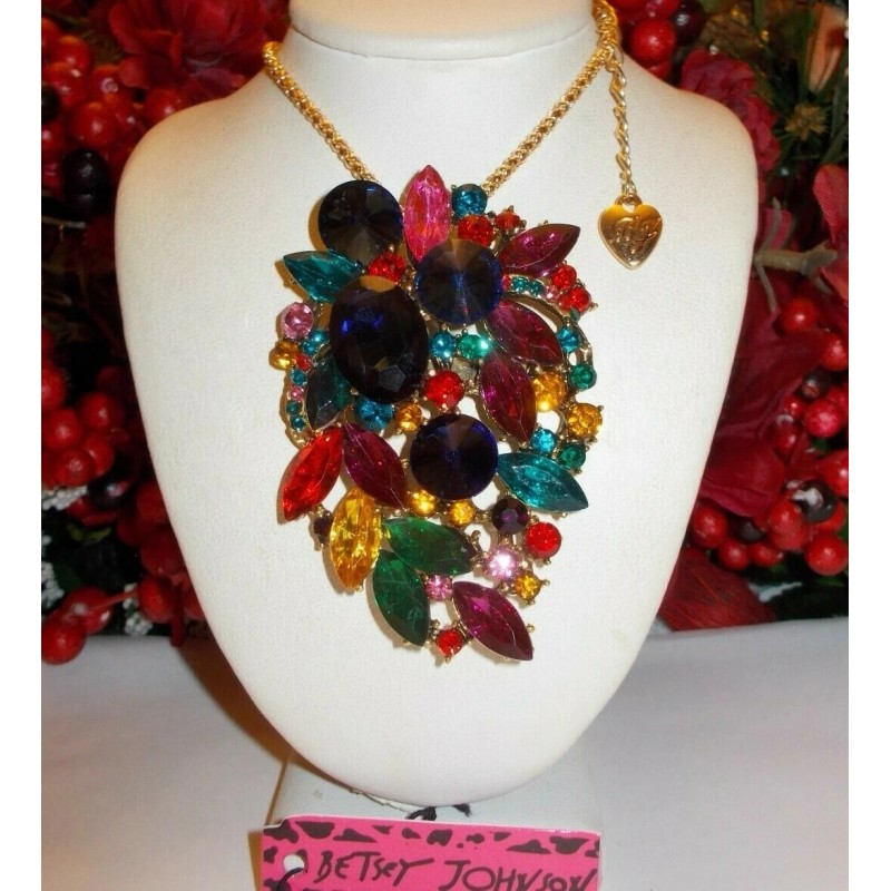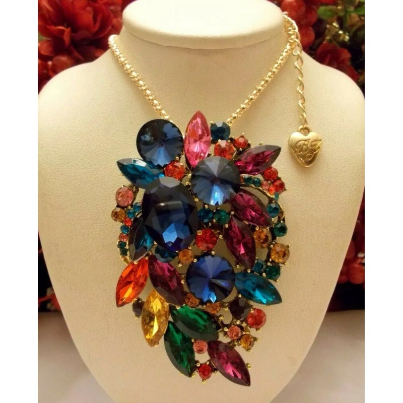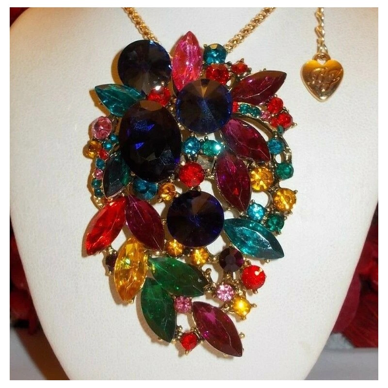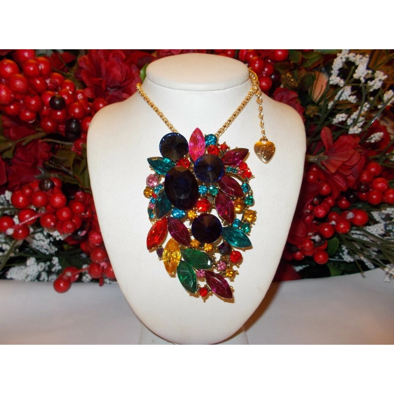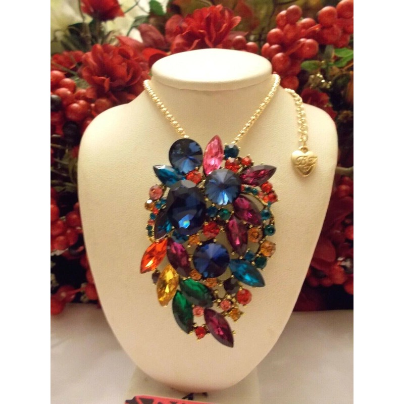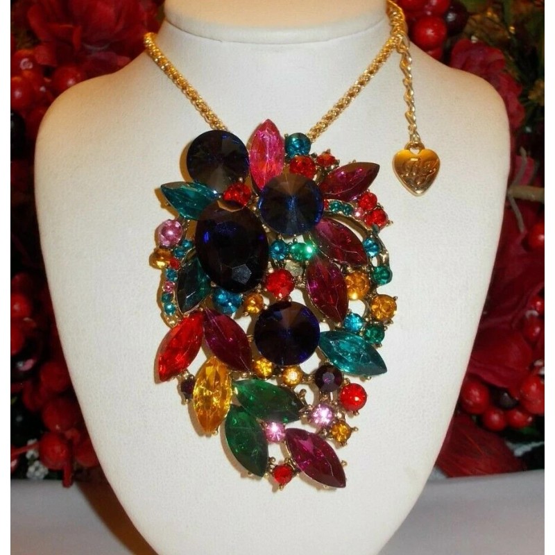 BETSEY JOHNSON SPARKLING MULTI COLOR RHINESTONE CLUSTER NECKLACE/BROOCH