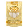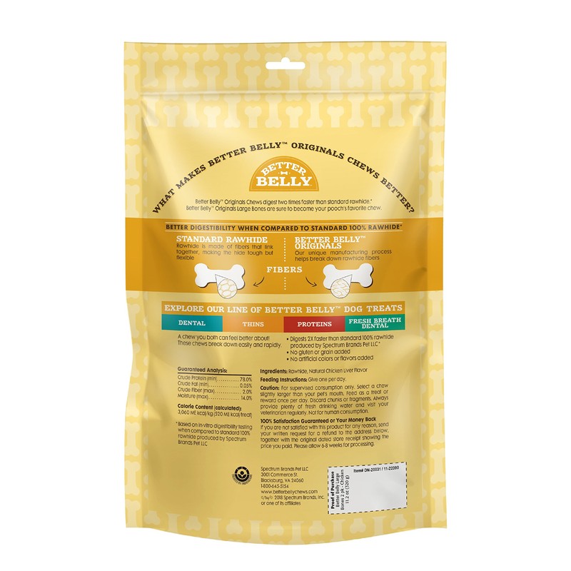 Better Belly digests two times faster than standard rawhide*. Better digestion for your dog means more peace of mind for you. Free of fillers, binders and artificial colors; these are sure to become your pooch's favorite new chew. Standard rawhide is made of millions of collagen fibers that link together makinge the hide tough abut flexible. Better Belly's patented technology breaks down the collagen fibers to make digestion quick and easy. Each chew is gluten free and breaks down easily and rapidly to help reduce the incidents of blockage within your dog's digestive tract. Better Belly Large Bones give your pup a classic shaped chew with original chicken liver flavor they love. Treat large size dog to these digestible bones and zip bag to close and preserve freshness. Finding the perfect chew that both you and your dog can love can be difficult, but Better Belly chews are here to make it easier. Always supervise your dog during consumption of chews.