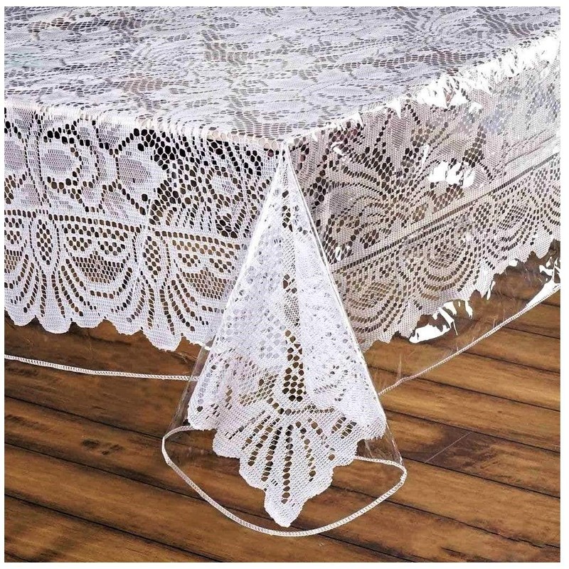 Window clear plastic tabletop cover keeps linen tablecloth clean and dry. Decorative for the tablecloth to enhance any event. Protects the furniture and tablecloth prevents damage from rips and liquid spills. Light weight with sewn edges, easy wipes clean with damp cloth.