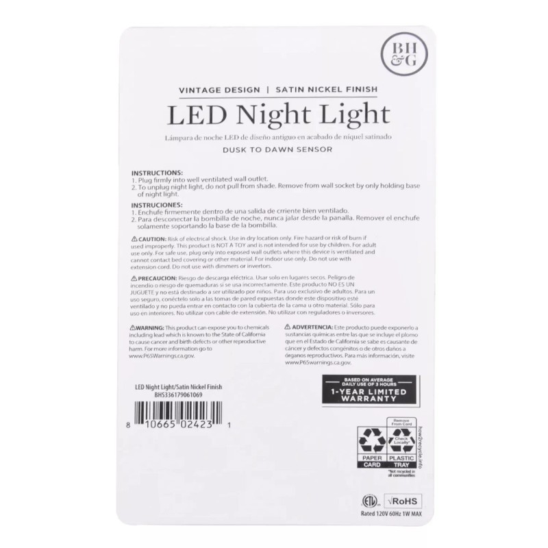 Better Homes & Gardens LED NIGHT LIGHT SOFT WHITE | SATIN NICKEL VINTAGE DESIGN