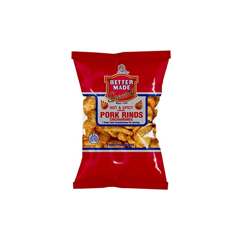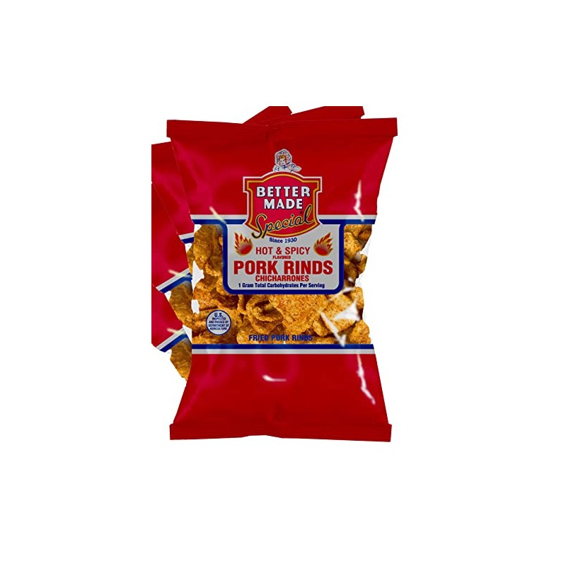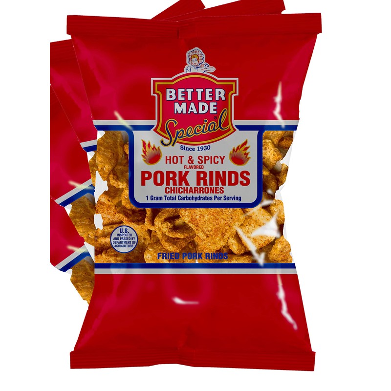 - Better Made HOT Flavored Pork Rinds Chicharrones - 8-Pack - 2.5oz Bags - 1g Carbs - Keto Friendly (ORIGINAL)