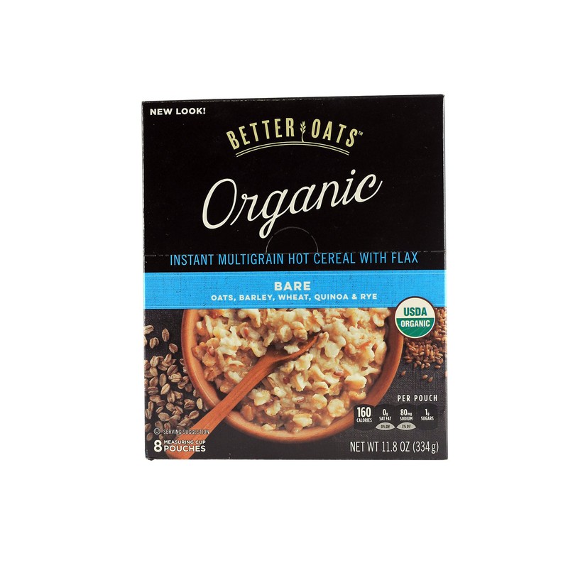 Better Oats Raw Pure & Simple Organic Bare, Instant Multigrain Hot Cereal with Flax, 8 Pouches (Pack of 2)