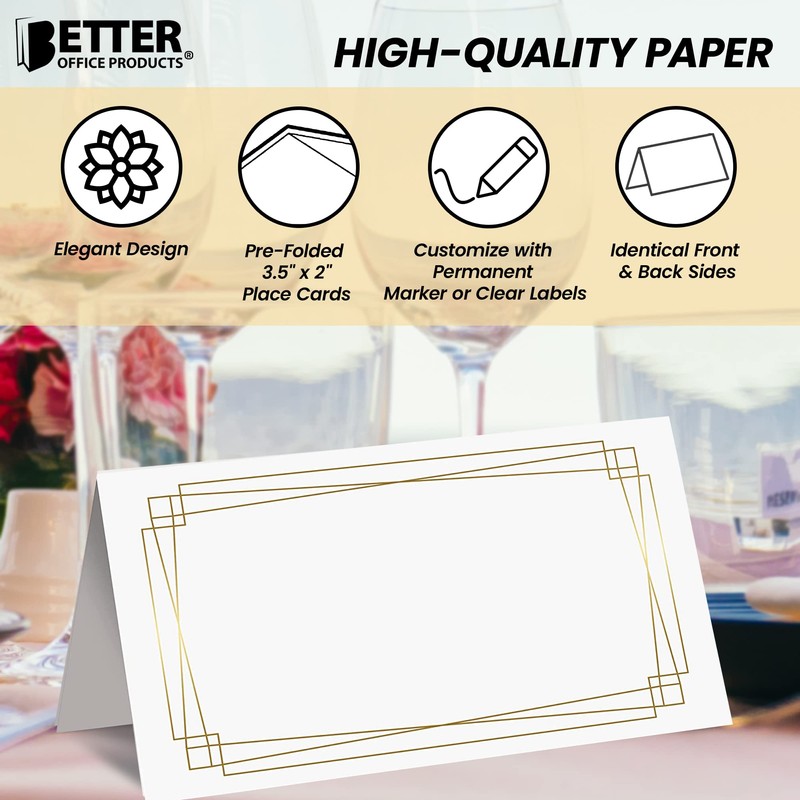 Better Office Products 100 Pack Place Cards, 2 x 3.5 in, White with Modern Metallic Gold Geometric Border, Folded Table Tent Cards for Weddings, Dinner Parties, Buffet Banquets,(100 Count)