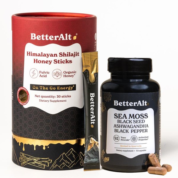 BetterAlt Peak Performance Support | GOLD+ Shilajit Cinnamon Honey Sticks & Sea Moss Capsules | Supports Energy & Immunity | Lab-Tested | 1-Month Pack