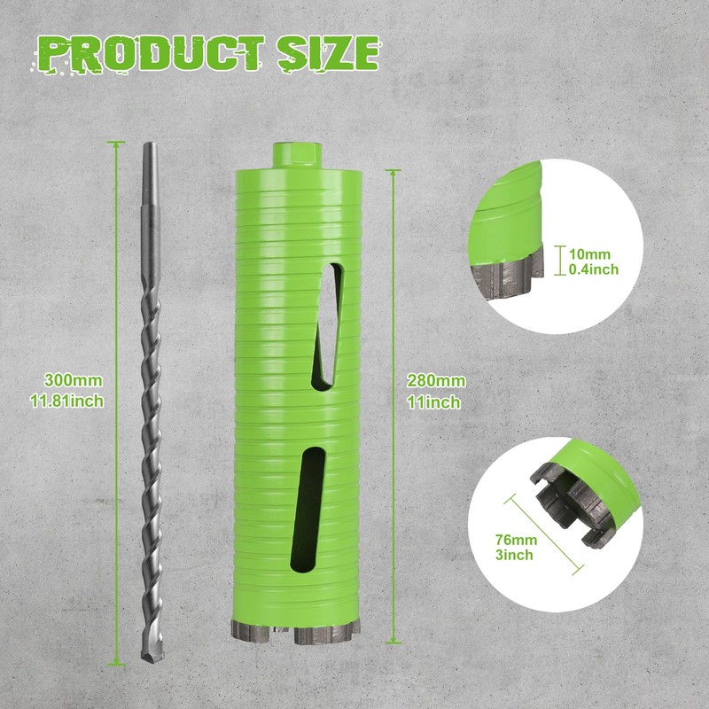 - COMPLETE PACKAGE: You will receive 3 inch core drill bit with pilot bit*1, drift key*1, 5/8"-11 thread male to 1/2" hex shank adapter*1 and to SDS plus adapter*1. The included drift key allows for quick and easy removal of the pilot bit, enhancing convenience and efficiency