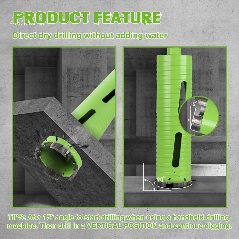 - WIDE RANGE OF APPLICATIONS: Designed for a variety of materials, including reinforced concrete, masonry, brick, plaster, block, stucco, and other hard materials. This dry core drill bit is suitable for your drilling needs in diverse construction and renovation projects