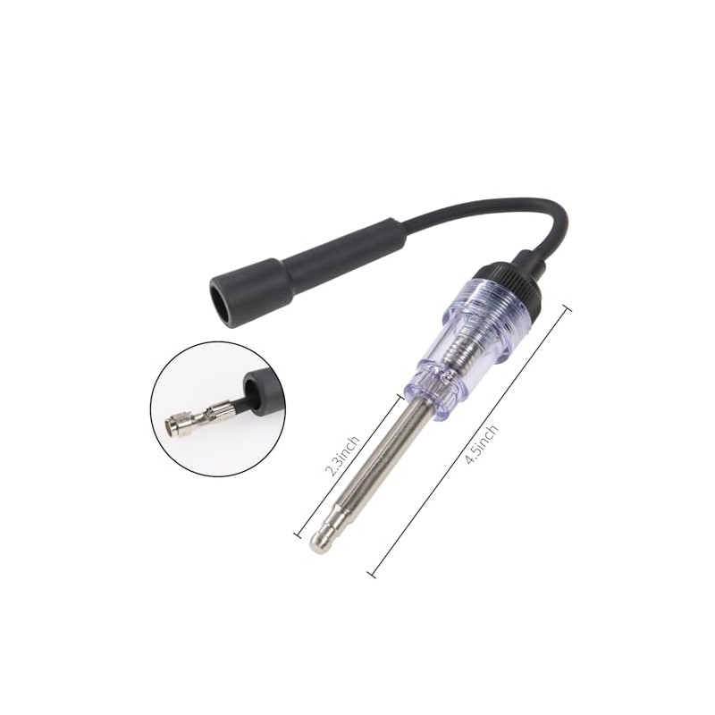 - SIZE - Ignition coil tester size is 2.28 inch metal interface, 4.44 inch shaft/lamp housing, 6.53 inch sheath/cable; This automotive coil tester is nickel plated shaft, Double ended flexible tool with internal bulb lasts for several years and is replaced by a transparent housing.
