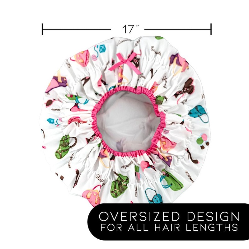 - OVERSIZED WITH FUN PATTERNS: Perfect for all hair lengths and thicknesses, the Fashionista Collection shower caps feature an oversized design that can cover more hair. They're accented with stylish rouching and trimmed in colorful, modern designs. Make every shower a fashion show and choose from a fun variety of patterns to match your style and personality.