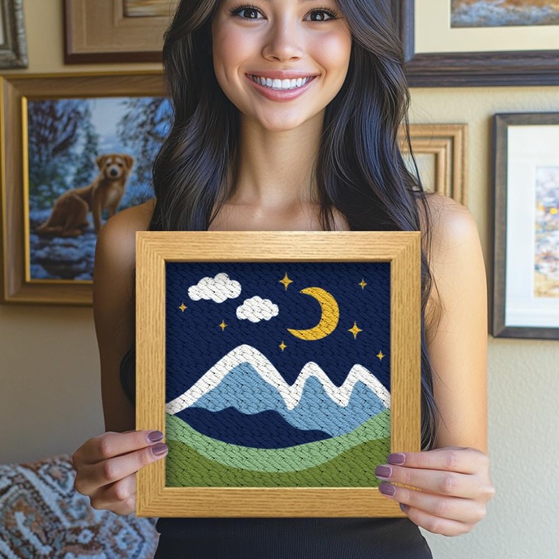 - Already Scenery Theme Framed Punch Needle Kit: Package includes 2 framed punch needle cloth (9.4inch*9.4inch/24 cm*24 cm), a punch needle hook, a instruction pattern, 13 colors of yarns and other tools you will need.