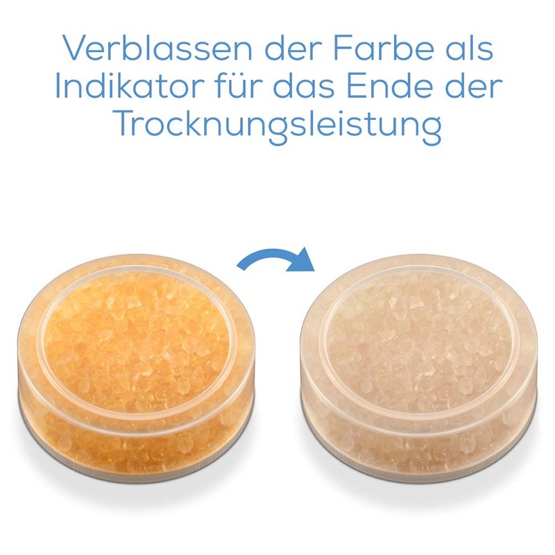 - The colour indicator shows you when the drying capsule should be replaced. When drying performance decreases, the capsules fade from orange to a pale white
