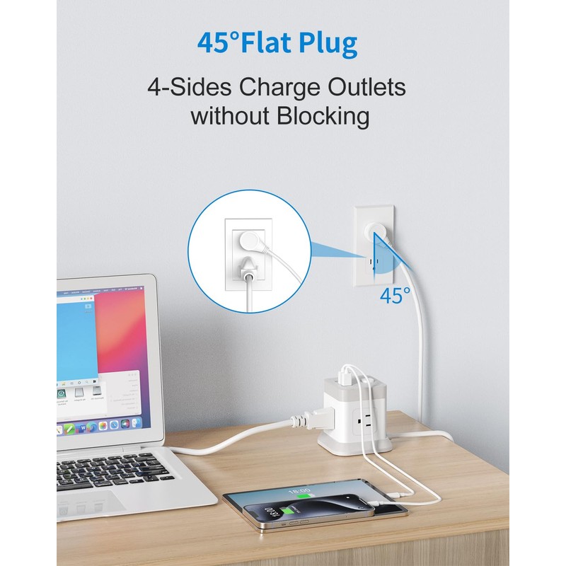 - 【7 in 1 Power Strip Cube】The USB tower is equipped with 3 USB(1 USB C) charging ports and 4 AC outlets in different directions, Provide power for up to 7 devices at the same time and all side outlet is designed for large adapters to charge without blocking each other, save your space and keep your desktop organized. You can charge your phone, lamp, laptop and other devices together.