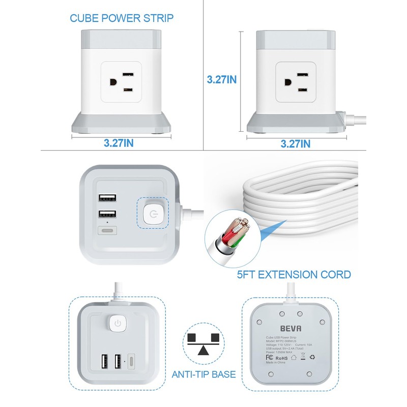 <p>BEVA Cube Desktop Power Strip with 4 Outlets & 3 USB Ports, 5ft Cord for Travel Cruise Ship Home Office Dorm Room Desktop Charging Station: 4 AC outlets and 3 USB ports(1 USB C) enables you maximumly charge 7 electric appliances at the same time. Multiple Protections: Overload, overcurrent, over-voltage, short circuit, ABS and PC fire retardant material and 100% pure copper power cable provide you and your electrical devices a complete protection. Long Life Span: We are always dedicated to providing our customers high quality products. The power strip has been strictly tested many times during the production process and can bear 25,000 times of plug/unplug. Compact & Handy Design: About the size of a rubik cube, a perfect travel companion in your trip. Specifications: Product Dimension: 3.27*3.27*3.35 inch(L*W*H) Interface: 4 AC Outlets & 3 USB Ports(1 USB C) Unit Weight: 0.75lb Cable Length: 1.5m/5ft Voltage: 100~125V, 50-60Hz Rated Power: 1250W USB Outputs: 5V/2.4A Cord Specification: 18AWG/10A Material: ABS & PC Fire Resistant Plastic NOTES: The power strip is not waterproof. Please do not touch it if your hands are wet.</p>