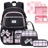 Bevalsa Backpack for Gilrs, Bow Plaid Bookpack with Bento Lunch Box, Insulated Bag & Utensils, 34oz Lunch Containers School Bags Set for Children Teens Kids Elementary Middle Student (Black Pink)