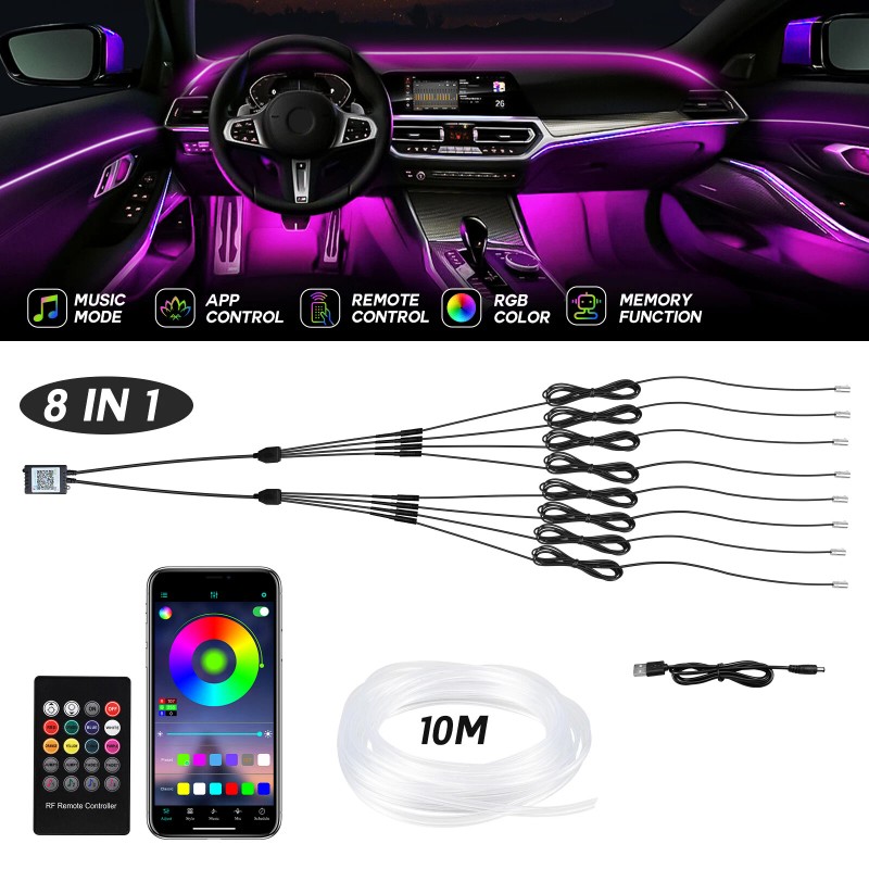 BEVINSEE 10M RGB 8 LED Car Interior Fiber Optical Strip Lights Atmosphere Lamp Remote App
