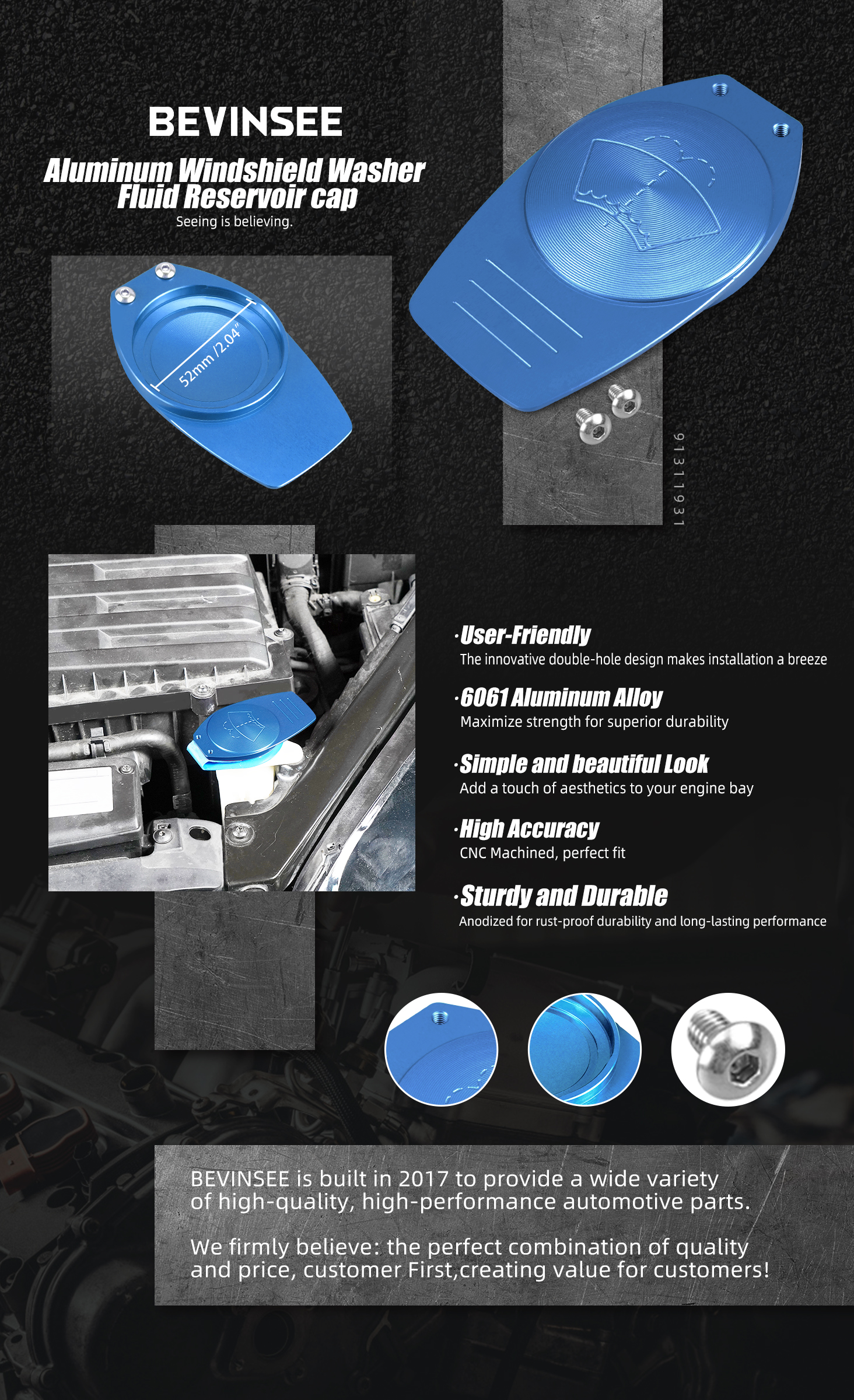 【User-Friendly】The innovative double-hole design allows you to use the internal fixing buckle directly or remove the ring from the factory plastic cover and secure it to BEVINSEE aluminum washer fluid reservoir cap with screws.
