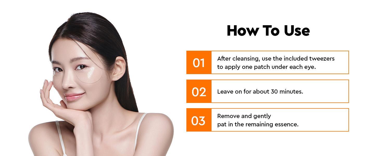 - How to Use: Apply the eye patch under both eyes. Remove after 20 to 30 minutes, then tap to absorb any remaining liquid.