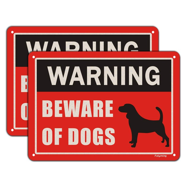 - "Warning Beware of Dog" Warning Dog signs highly visible red, black, and white design is sure to catch the eyes of any intruders. People will be warned that they are in danger of meeting up with your ferocious dog should they try to enter when they notice this visible warning dog sign.