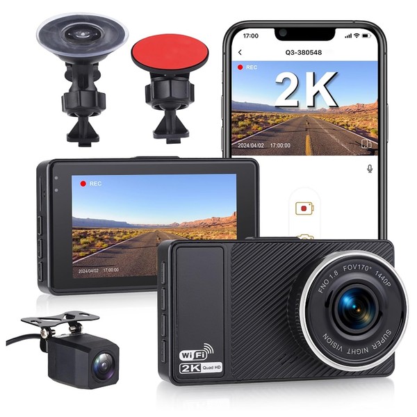 Bewinner Dash Cam Front and Rear (2K+1080P), 3 Inch Screen APP Control WiFi Dashcam, Car Camera with Sensor / 170° Wide Angle/Night Vision/Loop Recording for Auto