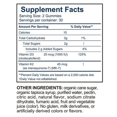 DELICIOUS & CONVENIENT - Our vegetarian, gelatin-free Vitamin D3 + K2 Gummies for adults are a great-tasting, convenient way to get a healthy dose of these important nutrients. They provide 1000 IU vitamin D3 + 45 mcg vitamin K2.