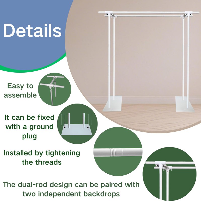 - Double Crossbar Design: The double crossbar background stand can hang 2 backdrops of different colors or styles at the same time, achieving quick switching of background and greatly improving efficiency and practicality.
