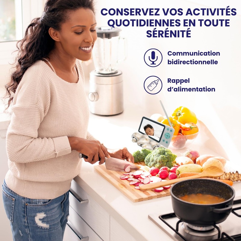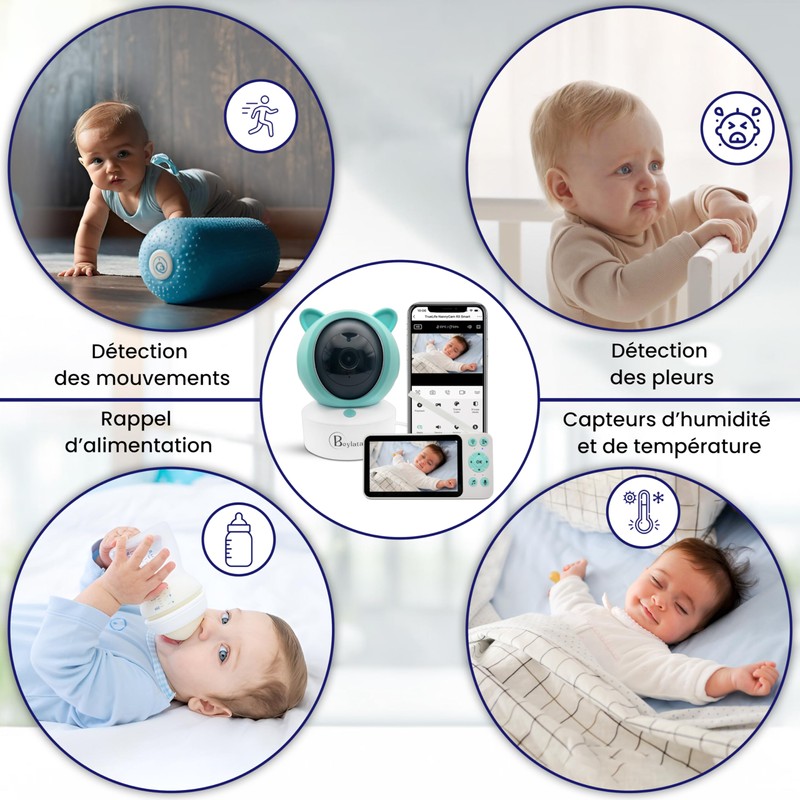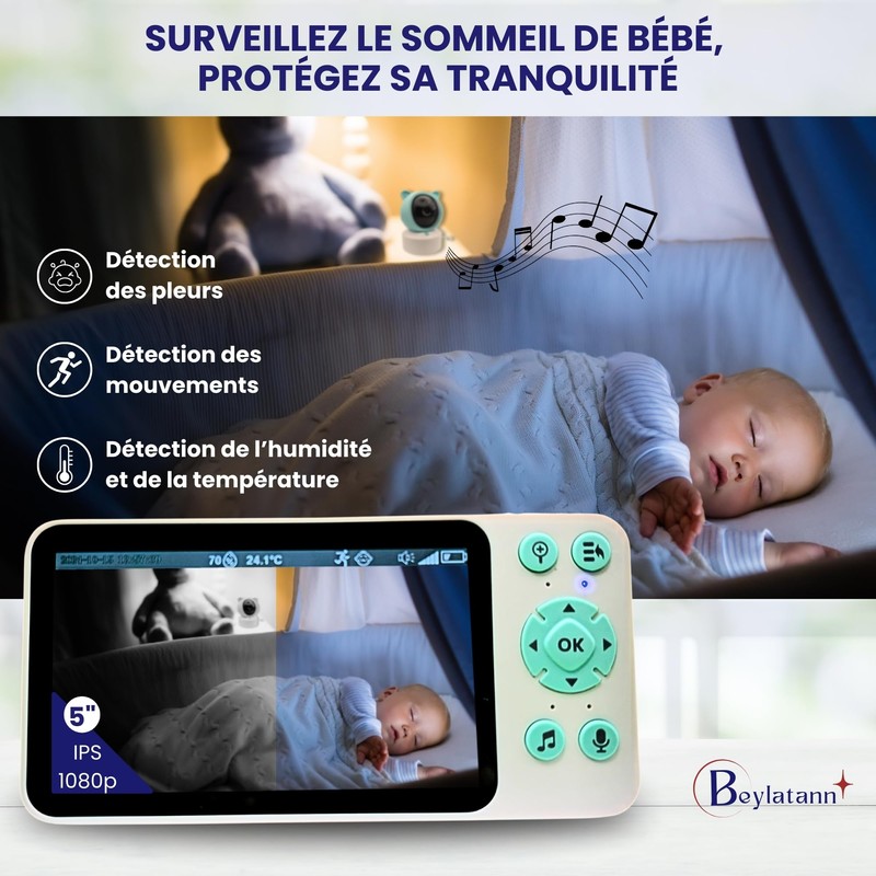 Beylatann Babyphone, 5 Zoll, 1080p, LCD-IPS, WLAN, VOX, Aufnahme, SD-Karte, Cloud, Nachtsicht, Bewegungserkennung, Wiegenlieder, 360° Pan-Tilt, Babyphone + Halterung