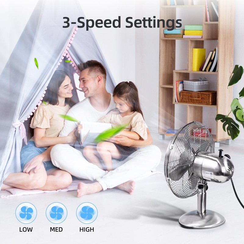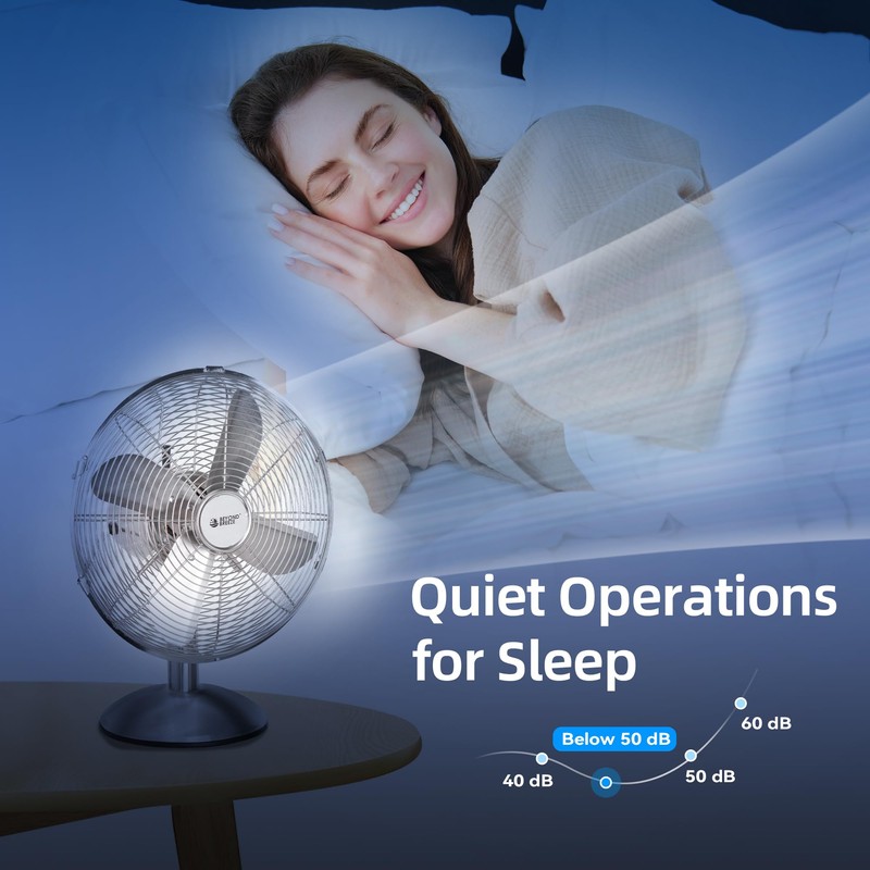 - 80° Wide Oscillation & Adjustable Tilt: Designed for maximum coverage, this metal desk fan features an 80° wide oscillation that evenly distributes air across a large area. The adjustable tilt function lets you precisely direct the airflow to your desired spot, ensuring every corner of your room stays cool and comfortable with minimal effort.