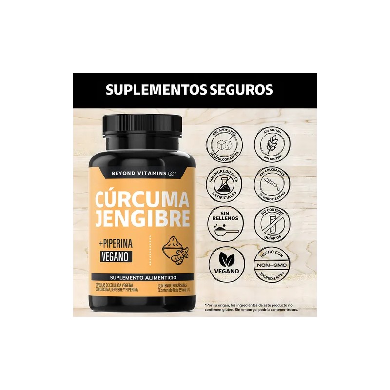 Beyond Vitamins | Raíz de Cúrcuma (curcumina) + Jengibre potenciado con Pimienta Negra (Piperina) – Máxima Absorción y Calidad Garantizada | Vegano | Curcuminoides (60 Cápsulas)