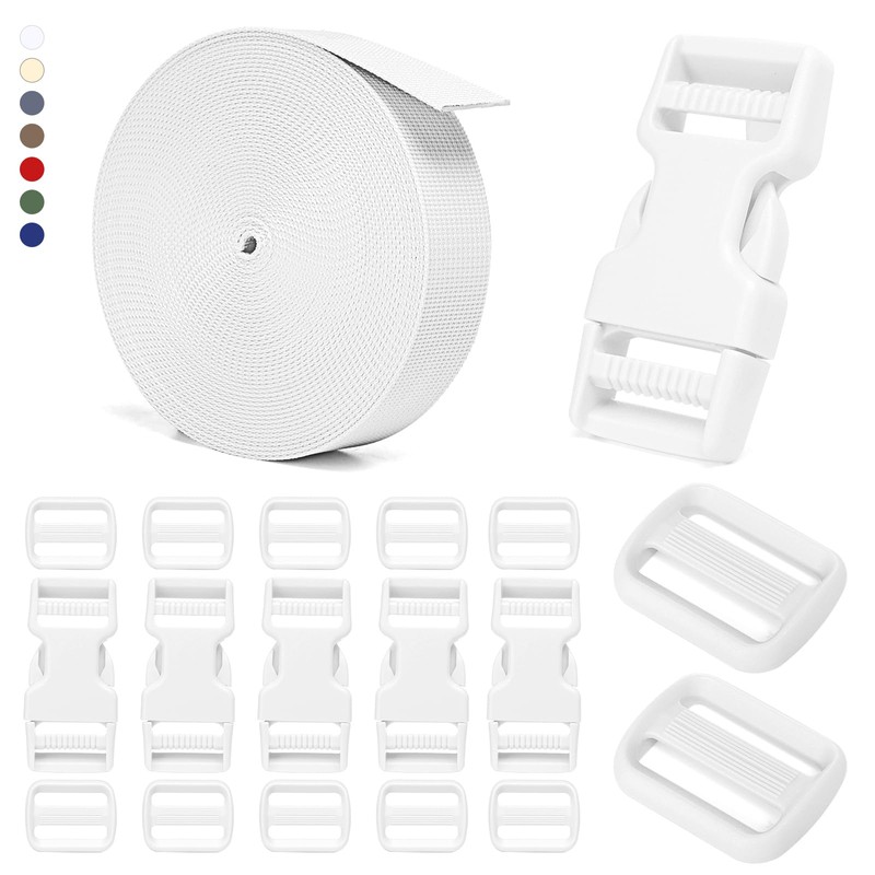 BEYOURD Buckle and Strap Set, 10 Yards Polyester Webbing Strap with 6 Dual Adjustable Side Release Plastic Buckles, 12 Pieces Tri-Glide Slider Clips for Custom Projects (Everyday Series 1 Inch, White)