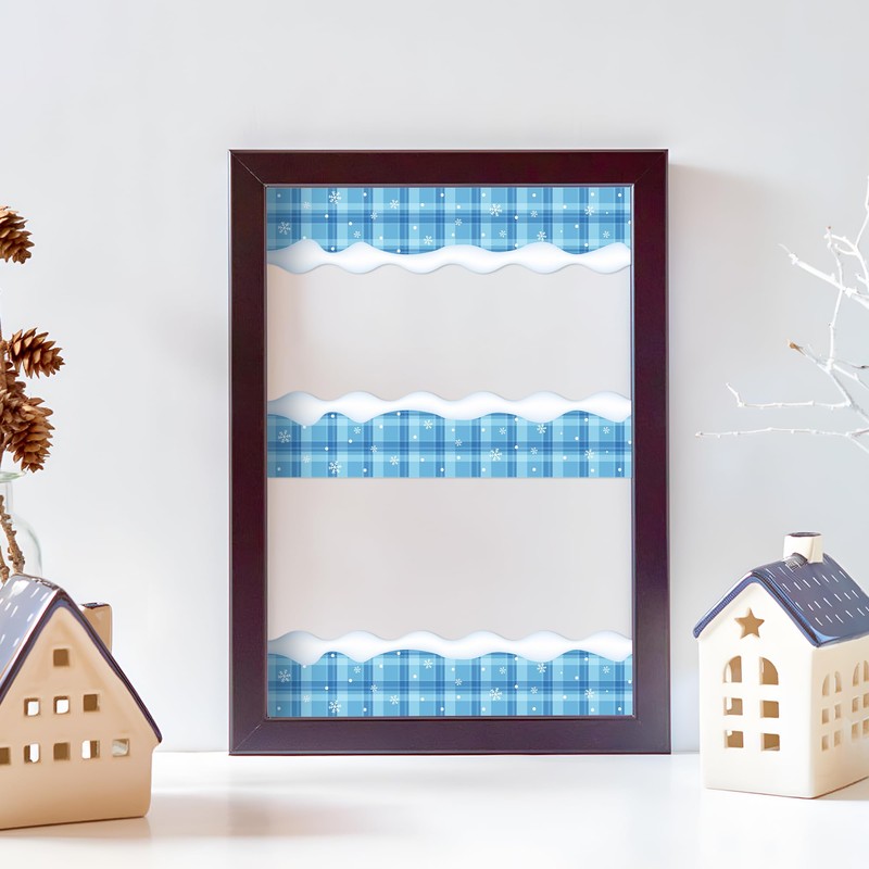 - Seasonal Aesthetics: Transform your space into a winter wonderland with our 65ft Winter Snowflake Plaid Scalloped Rolled Border Trim. The blue plaid base, accented with white snowflakes, and scalloped white snow edges create a festive and cozy atmosphere perfect for the holiday season