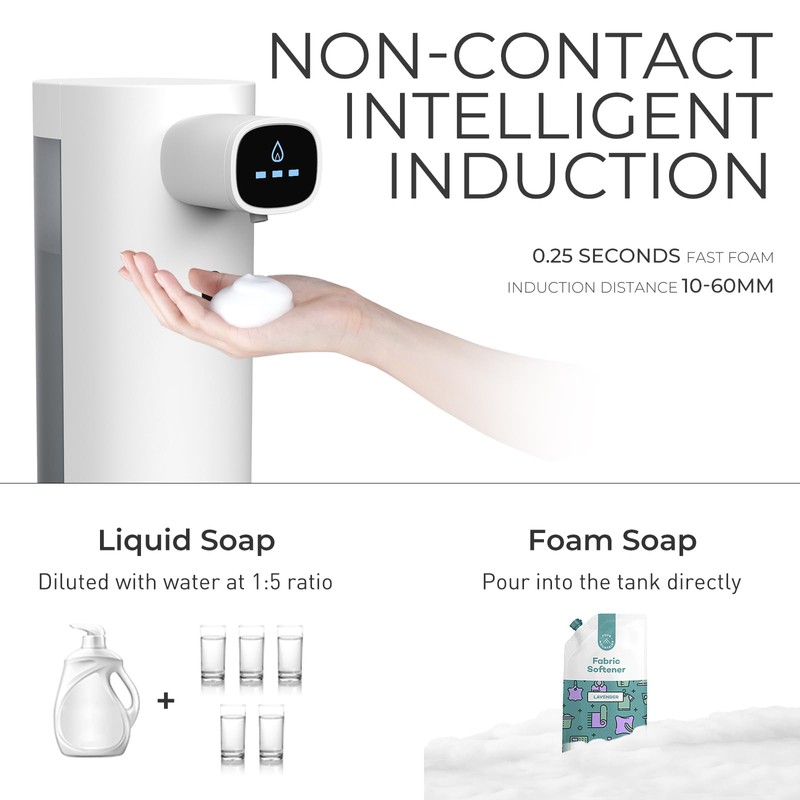 - 【3-level Foam Dispensing】Press the touch switch: 1st gear (0.6g) for children; 2nd gear (1g) for adults; 3rd gear (1.8g) for the whole family. Both for hand and dish washing. Foaming soap directly; ordinary liquid detergent needs be diluteded with water at 1:8.