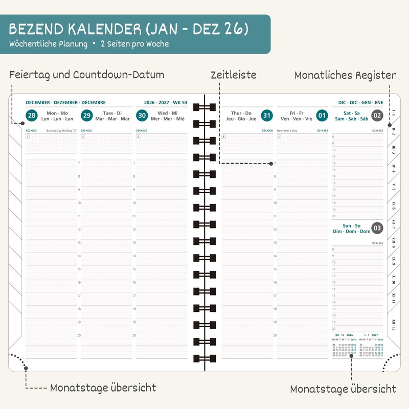 BEZEND Calendar 2026 Book Calendar A5 Ring Binder 1 Week 2 Pages Diary 2026 Weekly Planner with 80 g/m² Paper & Monthly Index Planner & Appointment Calendar with PU Leather Soft Cover - Dark Green