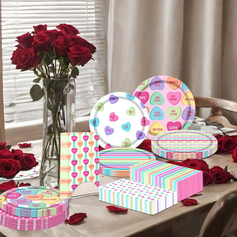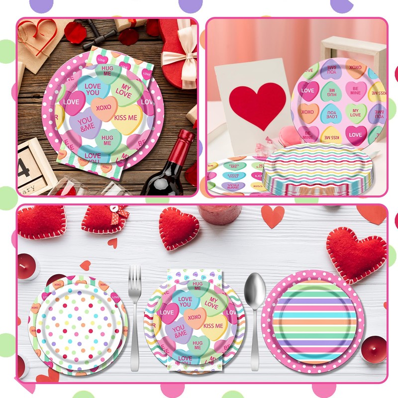 - SAVE TIME AND EFFORT:Choose valentines tableware that we don't need to clean heart themed party supplies .Just you should do is to throw disposable valentine's day paper plates and napkins away after valentine day party to finish the cleaning and free your hands.This conversation heart disposable dinnerware will give you more time to celebrate anniversaries with your lover