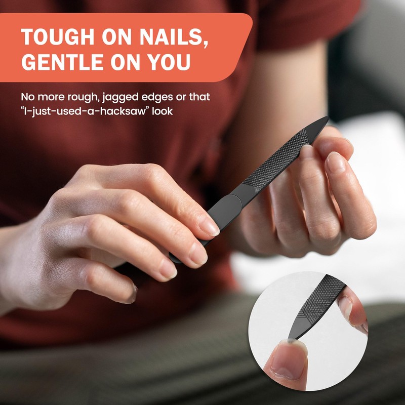 - METAL NAIL FILE: TOUGH ON NAILS,GENTLE ON YOU – When thick nails just won’t quit, bring out the heavy artillery—our Stainless Steel Nail File. This sturdy file is built to tame even the thickest of nails and leave you with smooth, well-shaped edges. No more rough, jagged edges or that “I-just-used-a-hacksaw” look