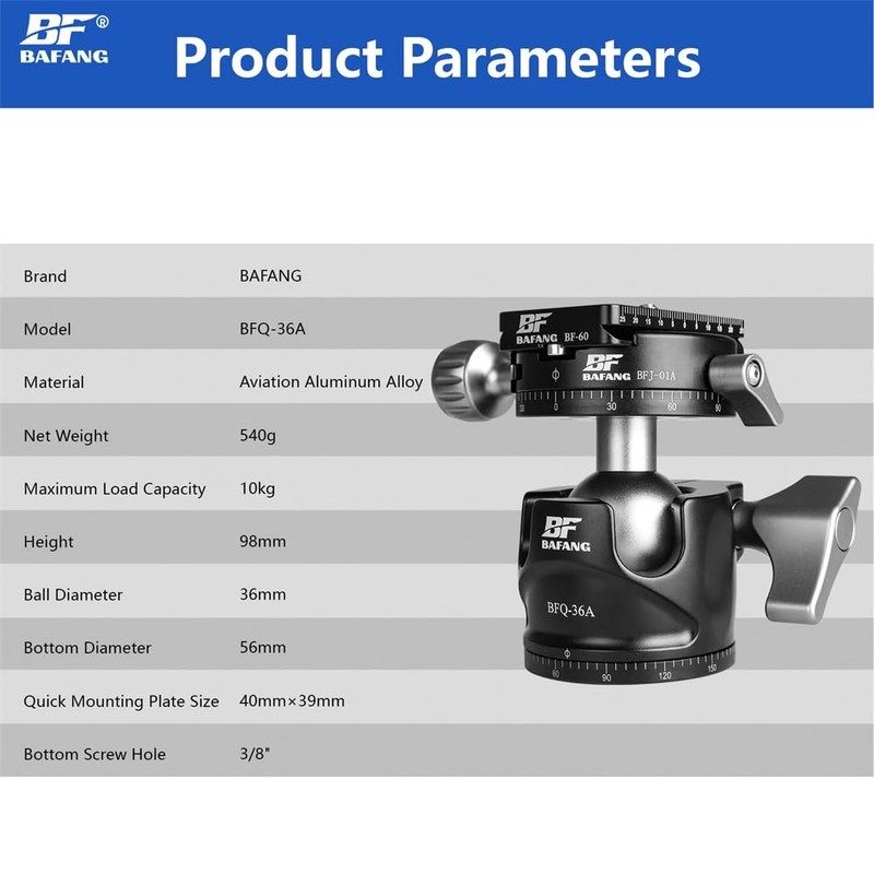 - High compatibility: BF BAFANG ball head tripod head with 1/4 inch thread and removable quick release plate for all SLR cameras. The lower 3/8 screw holes can be mounted tripod heads on tripod, monopod or camera slider.