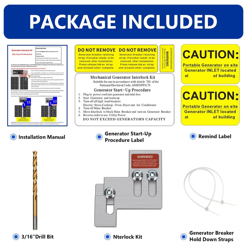 - 【PRODUCTS INCLUDE】Generator interlock kit top and bottom interlock plates x1, shoulder screws x3, hex nuts x3, generator start-up procedure label x1, reminder labels x5, generator breaker retainer straps x2(11.8 inches x2), 3/16''drill bit x1. installation guide x1.